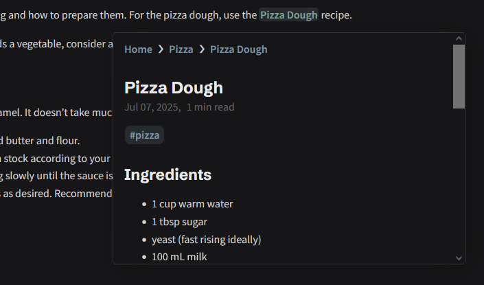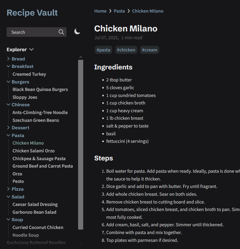 If you're interested consider checking out the Recipe Vault. Try out some recipes and let me know how they turn out. Obviously, I'd also recommend you check out Obsidian and Quartz to start your own Markdown-fueled website today.